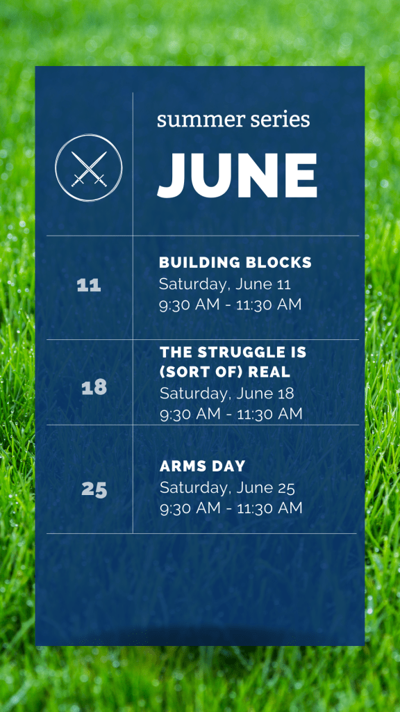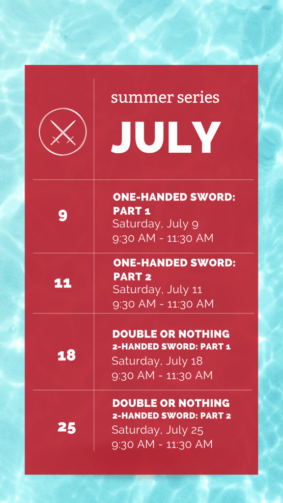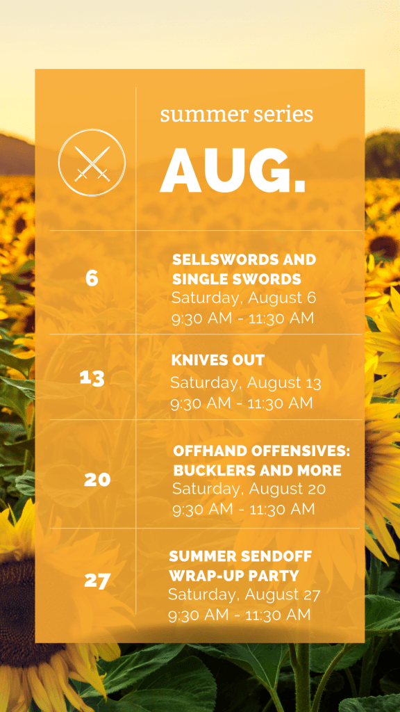 Summer isn’t over yet! Throughout August, we’ll focus on single swords, knives, defensive weapons, found objects, and close with a summer wrap-up party!